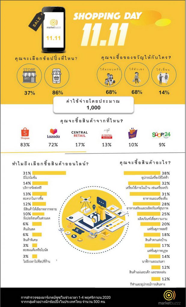 มาร์เก็ตบัซซได้ทำการสำรวจจากกลุ่มตัวอย่างของชายและหญิงในประเทศไทย จำนวน 500 กลุ่มตัวอย่างเพื่อสำรวจความสนใจของนักช้อปว่าพวกเขามีแผนการที่จะซื้อสินค้าอะไร และจะเลือกซื้อสินค้าจากที่ไหนในแคมเปญ 11.11 ที่กำลังจะมาถึงนี้ และนี่คือข้อมูลที่น่าสนใจ
