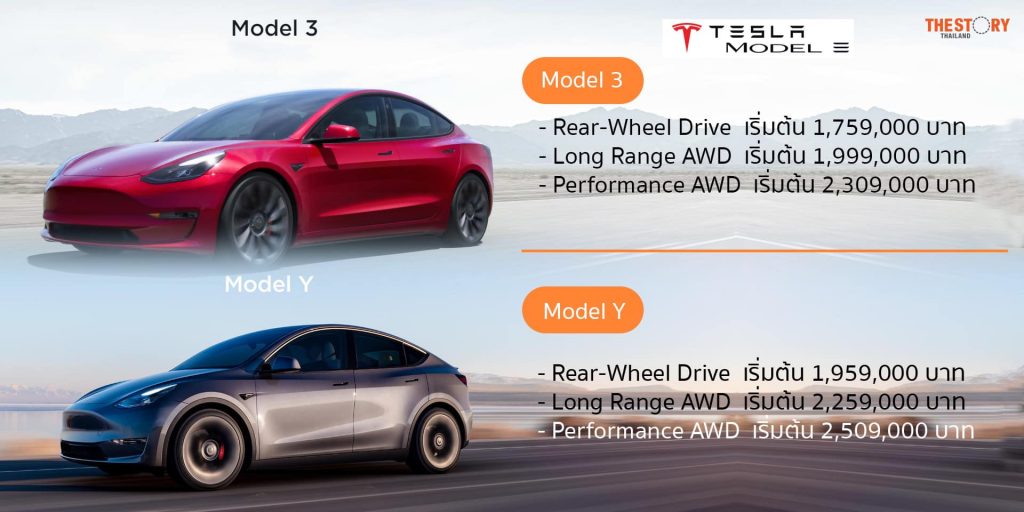 ส่วน Tesla Model Y เป็นรถอเนกประสงค์ SUV ไฟฟ้าที่ใช้แพลตฟอร์มซีดานจาก Model 3 ด้วยการออกแบบทั้งภายในและภายนอก รวมทั้งมีระบบส่งกำลังไฟฟ้าที่คล้ายกัน แต่มีพื้นที่เก็บสัมภาระสูงสุดถึง 2,100+ ลิตร เหมาะกับการขับขี่ทั้งในชีวิตประจำวัน การเดินทางไกล และการเดินทางตั้งแคมป์ สามารถขับข้ามจังหวัดได้ระยะทางไกลสุด 623 กม. ประกอบด้วย 3 รุ่นย่อย ได้แก่ รุ่น RWD (Rear-Wheel Drive) ราคา 1,959,000 บาท รุ่น Long Range (Dual Motor AWD) ราคา 2,259,000 บาท และรุ่น Performance (Dual Motor AWD) ราคา 2,509,000 บาท