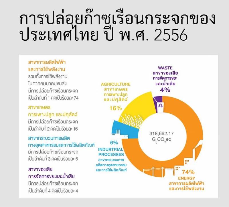 จากข้อมูลของ สำนักงานประสานการจัดการการเปลี่ยนแปลงสภาพภูมิอากาศ แหล่งที่มาของก๊าซเรือนกระจกของไทยมาจาก