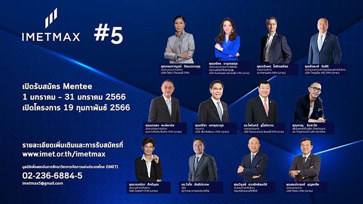 มูลนิธิเพื่อสถาบันการศึกษาวิชาการจัดการแห่งประเทศไทย (IMET) มุ่งสร้างอุทยานผู้นำ เพื่อเป็นศูนย์รวมผู้นำของชาติและเป็นศูนย์กลางการบ่มเพาะผู้นำรุ่นใหม่ให้ก้าวสู่ความเป็นผู้นำที่พร้อมทั้งความเก่งและความดี ควบคู่ไปกับการตอบแทนคุณสู่สังคมไทยได้ ผ่านโครงการ “IMET MAX” ที่รวมเหล่าผู้บริหารระดับสูงจากหลากหลายองค์กรชั้นนำของประเทศมาเป็น “เมนเทอร์” (Mentor) ถ่ายทอดประสบการณ์อันมีค่าที่สะสมมายาวนาน ตลอดทั้งให้คำชี้แนะ ให้คำปรึกษา ให้มุมมองสะท้อนย้อนคิด (Reflection) และสร้างแรงบันดาลใจให้กับ “เมนที” (Mentee) ซึ่งเป็นผู้นำรุ่นใหม่ที่มีศักยภาพสูงของสังคม ล่าสุด พร้อมเดินหน้าสู่ปีที่ 5 “IMET MAX 5” ดึง 12 ผู้บริหารชั้นนำระดับประเทศร่วมเป็นเมนเทอร์ (Mentor)