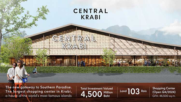 - เผยโครงการใหม่ล่าสุด Central Krabi งบลงทุน 4,500 ล้านบาท เปิดช่วง Q4/2567 มิกซ์ยูสเมืองท่องเที่ยว ซึ่งจะเป็น The New Gateway to Southern Paradise ที่ตั้งอยู่ใจกลางเมือง ประกอบด้วยศูนย์การค้า ที่อยู่อาศัย และโรงแรม เติมเต็มศักยภาพของกระบี่ที่เป็นเมืองที่มี world’s most famous islands และเป็น Top 5 จุดหมายปลายทางของนักท่องเที่ยวทั่วโลก โดยจะเป็น the first & largest complete landmark ที่ช่วยกระตุ้นเศรษฐกิจของจังหวัดและประเทศ