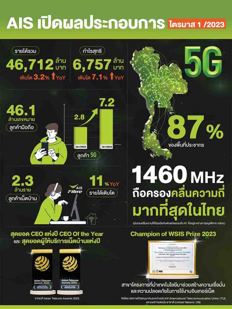 “ส่งผลให้ผลการดำเนินงานในไตรมาสแรกของปีนี้ AIS มีรายได้รวมอยู่ที่ 46,712 ล้านบาท เติบโต 3.2% เมื่อเทียบกับปีก่อน และมีกำไรสุทธิที่ 6,757 ล้านบาท แสดงถึงสถานะทางการเงินที่แข็งแกร่ง พร้อมกับการเดินหน้าพัฒนานวัตกรรม และส่งมอบคุณภาพและความครอบคลุมของโครงข่าย 5G และ เน็ตบ้าน อย่างต่อเนื่อง