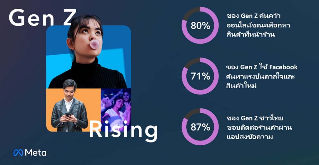 ปัจจุบัน มีผู้คนจำนวนกว่า 3.8 พันล้านคนทั่วโลกที่ใช้งานแอปในเครือของ Meta ในแต่ละเดือน สำหรับในประเทศไทย ผลสำรวจล่าสุดเผยว่า ในแต่ละเดือน 91% ของกลุ่มผู้บริโภควัย Gen Z ใช้งาน Facebook เพื่อรับข้อมูลข่าวสารและดูเนื้อหาสื่อต่าง ๆ ส่วน 85% ของ Gen Z มีการรับชมเนื้อหาต่าง ๆ ผ่าน Messenger และ 83% ใช้งานผ่านทาง Instagram ทำให้ Meta เป็นแหล่งที่มาของการเชื่อมต่อบนโลกโซเชียล ธุรกิจการค้า และการค้นพบที่สร้างแรงบันดาลใจสำหรับชาวไทย ที่กำลังมองหาการมีปฏิสัมพันธ์กับผู้อื่น