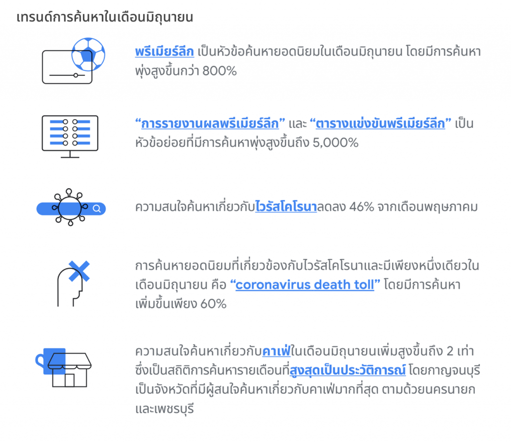 - พรีเมียร์ลีก เป็นหัวข้อค้นหายอดนิยมในเดือนมิถุนายน โดยมีการค้นหาพุ่งสูงขึ้นกว่า 800%