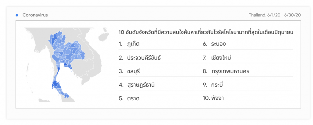 10 อันดับจังหวัดที่มีความสนใจค้นหาเกี่ยวกับไวรัสโคโรนามากที่สุดในเดือนมิถุนายน