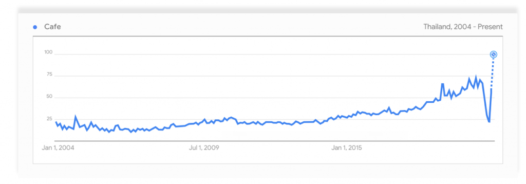 ชาร์ต: ความสนใจค้นหาเกี่ยวกับคาเฟ่ในประเทศไทย ตั้งแต่ปี 2547 จนถึงปัจจุบัน
