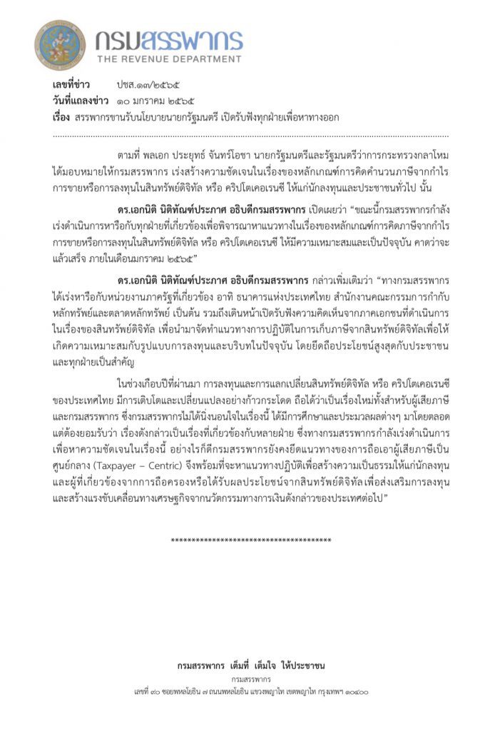 อย่างไรก็ดี กรมสรรพากรยังคงยึดแนวทางของการถือเอาผู้เสียภาษีเป็นศูนย์กลาง (Taxpaayer Centric) จึงพร้อมที่จะหาแนวทางปฏิบัติเพื่อสร้างความเป็นธรรมให้แก่นักลงทุนและผู้ที่เกี่ยวข้องจากการถือครองหรือได้รับผลประโยชน์จากสินทรัพย์ดิจิทัล เพื่อส่งเสริมการลงทุนและสร้างแรงขับเคลื่อนทางเศรษฐกิจจากนวัตกรรมทางการเงินดังกล่าวของประเทศไทยต่อไป
