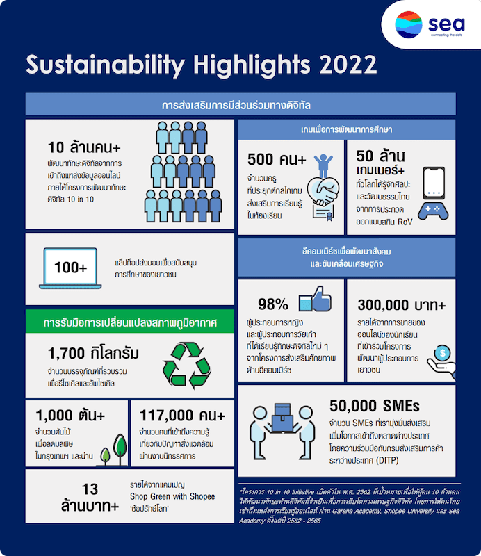 แม้ว่าโครงการความยั่งยืนของ Sea (ประเทศไทย) จะโดดเด่นด้านการสร้างอิมแพคเชิงบวกทางสังคมและเศรษฐกิจ และมุ่งพัฒนาทักษะดิจิทัลเป็นหลัก แต่ก็ไม่ได้ทิ้งด้านการรับมือกับสภาพอากาศแปรปรวนไป กอปรกับการเปลี่ยนแปลงทางสภาพภูมิอากาศนับเป็นปัญหาเร่งด่วนที่ไม่สามารถแก้ไขได้ในระยะสั้น จึงทํางานร่วมกับพันธมิตรและใช้ศักยภาพสูงสุดจากทรัพยากรขององค์กรในการลดผลกระทบที่เกี่ยวข้องกับสิ่งแวดล้อม การดำเนินงานที่ผ่านมาได้แก่