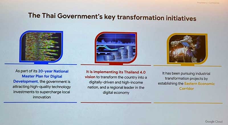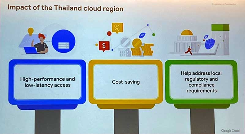 “จากการประกาศแผนติดตั้ง Cloud Region ในประเทศไทย Google Cloud วางเป้าหมายที่จะส่งเสริมนโยบายของรัฐบาลที่ต้องการรุกหน้าพัฒนาโครงสร้างพื้นฐานต่าง ๆ ของประเทศ อาทิ โครงการพัฒนาระเบียงเศรษฐกิจพิเศษภาคตะวันออก (EEC) และส่งมอบระบบโครงสร้างคลาวด์ที่จำเป็นต่อการปรับเปลี่ยนและเติบโตของภาคธุรกิจ ทั้งในด้านการใช้ข้อมูลให้เกิดประโยชน์สูงสุด การทำงานแบบไฮบริด หรือการมีแพลตฟอร์มที่ยืดหยุ่นต่อการเปลี่ยนแปลงในตลาดที่มีการพัฒนาอยู่เสมอ และต่อเงื่อนไขข้อกำหนดต่าง ๆ เราจึงรู้สึกตื่นเต้นกับโอกาสในการขยายโครงสร้างคลาวด์ เพื่อยกระดับประเทศไทยไปสู่กลุ่มประเทศที่มีศักยภาพในการแข่งขันสูง ที่มาพร้อมกับนวัตกรรมที่จะช่วยขับเคลื่อนเศรษฐกิจดิจิทัลในเขตเอเชียตะวันออกเฉียงใต้ ซึ่งคาดว่าจะสร้างมูลค่าได้สูงถึง 36.25 ล้านล้านบาท (1 ล้านล้านดอลลาสหรัฐฯ) ภายในปี 2573 นี้”