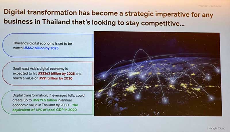 ทั้งนี้ Cloud Region ในประเทศไทย จะให้บริการธุรกิจและระบบคลาวด์ศักยภาพสูงที่จำเป็นต่อองค์กร เพื่อเร่งให้เกิดการเปลี่ยนแปลงเข้าสู่ดิจิทัล และสร้างข้อได้เปรียบใหม่ ๆ ในการแข่งขัน ตลอดจนตอกย้ำเจตนารมณ์ของ Google Cloud ที่ต้องการสนับสนุนแผนพัฒนาเศรษฐกิจในเฟสต่อไปของรัฐบาลไทย ทั้งนี้ รายงานจากผลวิจัยของ AlphaBeta ภายใต้การสนับสนุนของ Google เผยว่า หากใช้ประโยชน์อย่างเต็มที่จากการเปลี่ยนแปลงทางดิจิทัล อาจสามารถสร้างมูลค่าทางเศรษฐกิจต่อปีได้สูงถึง 2.5 ล้านล้านบาท (79.5 พันล้านดอลลาร์สหรัฐ) แก่ประเทศไทย ภายในปี 2573 ซึ่งเทียบเท่ากับ 16% ของ GDP ท้องถิ่นในปี 2563