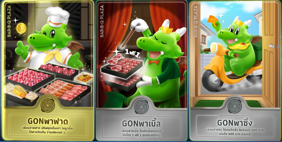 เรื่องราวของการ์ด – GON และทีมงาน Bar B Q Plaza ได้รับแรงบันดาลใจมาจากข้อมูลการทานของสมาชิก ที่พบว่าเมนูชุดประหยัดหมู เป็นเซ็ตเมนูขวัญใจสุดฮิตตลอดกาลของร้าน ปี 2021 GON จึงหยิบความฮิตของเมนูนี้ มาสร้างสรรค์เป็นการ์ดคาแรกเตอร์ที่ชื่อว่า “GONพาเบิ้ล” ภาพการ์ตูนแบบ 2 มิติ ของ GON ที่มาพร้อมพลังเวทมนต์ สวมชุดนักมายากล อวดมุมหล่อเท่ มีเสน่ห์แบบที่ไม่เคยเผยที่ไหน แต่ก็ยังคงความน่ารักสไตล์ GON ไว้ด้วย