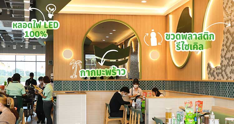 - วัสดุการตกแต่งร้าน มีการประยุกต์ใช้วัสดุที่ผ่านการ Upcycle จากขยะพลาสติก กากมะพร้าว แกลบข้าว และวัสดุที่มีการปล่อยคาร์บอนไดออกไซด์ต่ำกว่าวัสดุทั่วไป