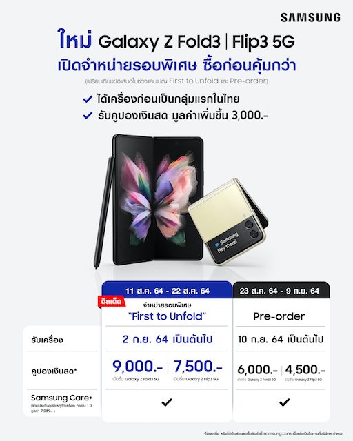 ทั้งนี้ ซัมซุงได้เปิดจำหน่ายรอบพิเศษ ที่ซื้อก่อนคุ้มกว่า กับ ‘First to Unfold’ ตั้งแต่วันนี้ – 22 ส.ค. 64 นอกจากที่จะได้เครื่องก่อนเป็นกลุ่มแรกในไทย ในวันที่ 2 ก.ย. 64 เป็นต้นไปแล้ว ยังจะได้รับคูปองเงินสดเพิ่มขึ้นอีก 3,000 บาท รวมเป็นมูลค่า 9,000 บาท เมื่อซื้อ Galaxy Z Fold3 5G หรือมูลค่า 7,500 บาท เมื่อซื้อ Galaxy Z Flip3 5G เมื่อเทียบกับช่วงพรีออเดอร์ (23 ส.ค. – 9 ก.ย.) ที่จะได้เพียง 6,000 และ 4,500 บาทตามลำดับเท่านั้น ไม่รวมถึงการรับฟรีบริการ Samsung Care+ 1 ปี มูลค่า 7,089 บาทอีกด้วย คลิกเข้าไปดูรายละเอียดได้แล้ววันนี้ที่ https://www.samsung.com/th/zfold3/buy