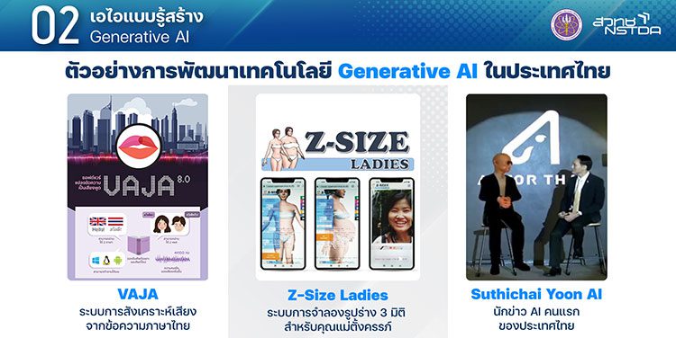 ในประเทศไทย เนคเทค สวทช. ทำวิจัยที่เกี่ยวข้องกับ Generative AI มาอย่างต่อเนื่อง เช่น สร้าง VAJA ที่เป็นระบบการสังเคราะห์เสียงจากข้อความภาษาไทย เพื่อสร้างคำบรรยายภาพที่เป็นภาษาไทยอย่างอัตโนมัติ และโครงการ Z-Size Ladies ที่เป็นระบบการจำลองรูปร่างแบบ 3 มิติ สำหรับคุณแม่ที่ตั้งครรภ์ระยะ 2-40 สัปดาห์มหาวิทยาลัยเกษตรศาสตร์ใช้ GAN เรียนรู้สไตล์ฟอนต์ภาษาอังกฤษ เพื่อประยุกต์ใช้สร้างฟอนต์ภาษาไทยใหม่ๆ