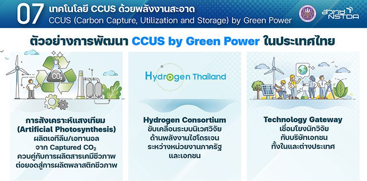 ปัจจุบัน สวทช. มีงานวิจัยเกี่ยวกับเทคโนโลยี CCUS ทั้งใน NANOTEC, ENTEC, และ MTEC ซึ่งได้รับความสนใจจากเอกชนที่มีพันธกิจในการลดก๊าซเรือนกระจก โดยเฉพาะอุตสาหกรรมพลังงานและปิโตรเคมีขนาดใหญ่ เช่น ปตท., ปตท.สผ., และ SCG นอกจากนี้ สวทช. ยังได้สร้างความร่วมมือกับพันธมิตร จนเกิดเป็น Hydrogen Consortium อันเป็นระบบนิเวศวิจัยและ Technology Gateway ที่เชื่อมโยงนักวิจัยกับบริษัทเอกชนทั้งในและต่างประเทศ