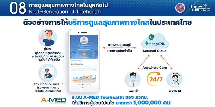ในประเทศไทย การให้บริการ telehealth มีแนวโน้มจะได้รับการยอมรับในการใช้งานมากยิ่งขึ้น จากการที่ได้บุคลากรสาธารณสุขและประชาชน เคยใช้ระบบนี้ในช่วง COVID-19 ในส่วนกรมการแพทย์ ปรับรูปแบบบริการทางการแพทย์ ออกจากโรงพยาบาลไปหาคนไข้ใน “ทุกที่ ทุกเวลา” ผ่าน telehealth ช่วยลดความแออัดของผู้ป่วยที่โรงพยาบาล ในส่วนของ สปสช. เริ่มให้โรงพยาบาลเบิกจ่ายการให้บริการผ่าน telehealth ได้แล้ว ทั้งนี้ในช่วงการแพร่ระบาดของ COVID-19 ระบบ A-MED Telehealth ที่ สวทช. พัฒนาขึ้น ได้ให้บริการผู้ป่วย COVID-19 ไปแล้วมากกว่า 1 ล้านคน