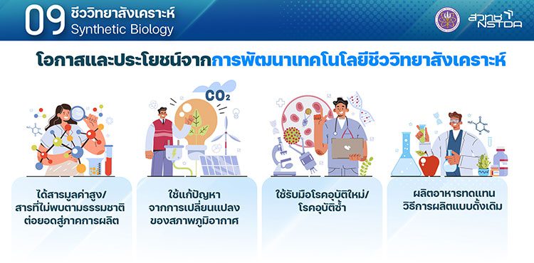 ประเทศไทยที่มีความได้เปรียบจากความหลากหลายตามธรรมชาติสูง จึงมีโอกาสจากการใช้เทคโนโลยีชีววิทยาสังเคราะห์ได้มาก ไบโอเทค สวทช. มีคลังทรัพยากรชีวภาพที่มีจุลินทรีย์มากเป็นลำดับต้นของโลก และมีเทคโนโลยีที่พร้อมทำวิจัยต่อยอดด้าน SynBio และ สวทช. ได้จัดเตรียมโครงสร้างพื้นฐานเพื่อการต่อยอดผลิตในปริมาณมากในโรงงานต้นแบบที่ EECi ตามนโยบายเศรษฐกิจแบบ BCG ที่เป็นวาระแห่งชาติ