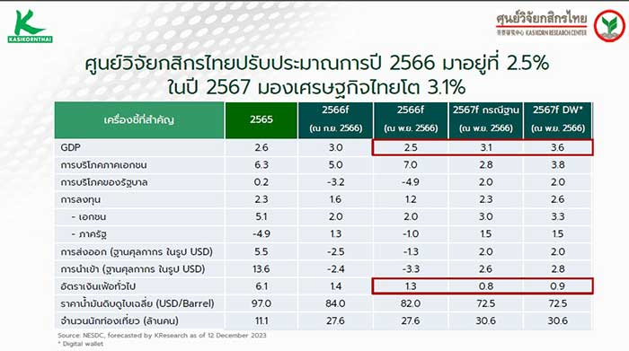 ศูนย์วิจัยกสิกรไทย ปรับลดประมาณการเศรษฐกิจไทยปี 2566 ลงมาอยู่ที่ 2.5% จาก 3.0% เนื่องจากเศรษฐกิจไทยยังได้รับผลกระทบจากการที่เศรษฐกิจโลกชะลอตัว โดยเฉพาะเศรษฐกิจจีนที่ยังคงเผชิญกับปัญหาในภาคอสังหาริมทรัพย์อยู่