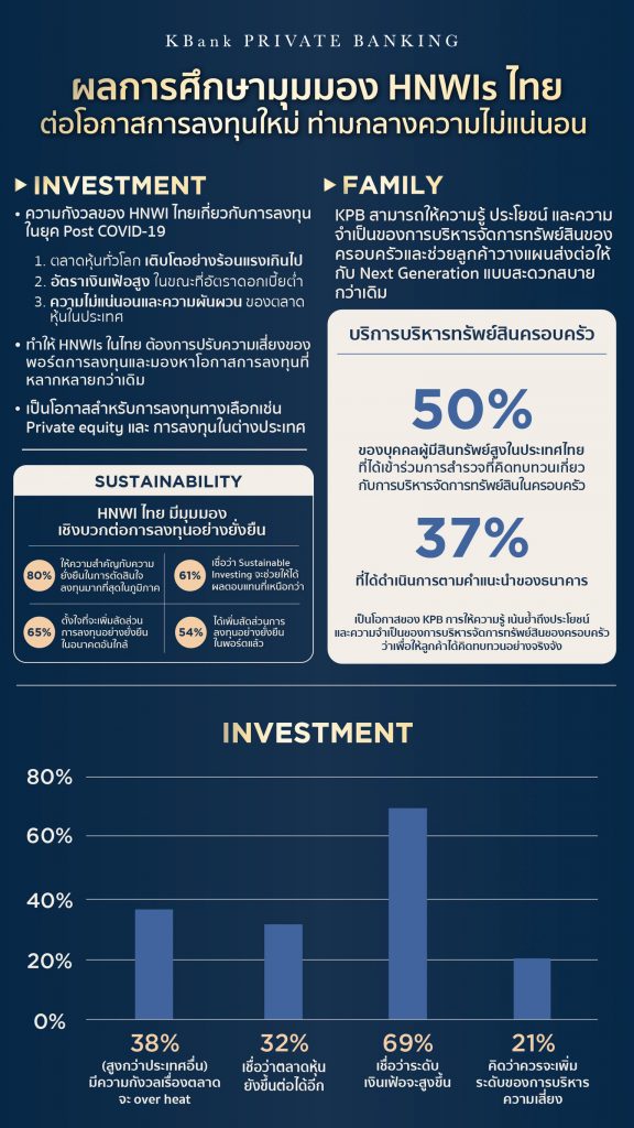 ล่าสุด KBank Private Banking ได้ร่วมกับ Lombard Odier และพันธมิตรทางธุรกิจอีก 5 ราย ได้สำรวจความคิดเห็นกลุ่มผู้มีความมั่งคั่งสูง หรือ High-net-worth individual (HNWIs) จำนวน 620 ราย ใน 8 ประเทศ ทั่วเอเชียแปซิฟิก ใน 3 เรื่อง ได้แก่ การลงทุนและเศรษฐกิจโลก ประเด็นด้านครอบครัว และความยั่งยืน