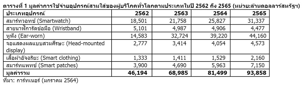 การ์ทเนอร์ อิงค์คาดการณ์การใช้จ่ายของผู้บริโภคไปกับอุปกรณ์สวมใส่ไฮเทค (Wearable Devices) ทั่วโลกปีนี้จะมีมูลค่ารวม 81.5 พันล้านดอลลาร์สหรัฐฯ เพิ่มขึ้น 18.1% จาก 69 พันล้านดอลลาร์สหรัฐ ในปีที่ผ่านมา โดยการทำงานระยะไกลและความใส่ใจตรวจเช็กสุขภาพที่เพิ่มขึ้นของผู้คนช่วงการแพร่ระบาดโควิด-19 เป็น 2 ปัจจัยสำคัญเร่งผลักดันการเติบโตของตลาด