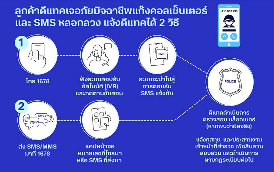 ลูกค้าดีแทคเจอภัยมิจฉาชีพแก๊งคอลเซ็นเตอร์ และ SMSหลอกลวง แจ้งดีแทคได้ 2 แนวทาง ดังนี้