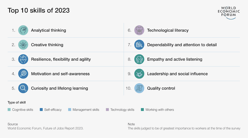 ข้อมูลจาก World Economic Forum ระบุว่ามนุษย์ในปี 2030 ต้องมีทักษะ 10 ทักษะใน 3 กลุ่มหลัก เพื่อให้อยู่รอดต่อไปได้ในโลกที่มีการเปลี่ยนแปลงอยู่ตลอดเวลาและเป็นทักษะที่โลกต้องการ ดังนี้