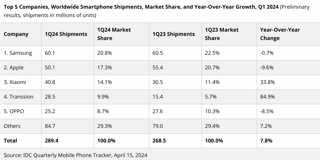 จากข้อมูลเบื้องต้นของ International Data Corporation (IDC) ในรายงาน Worldwide Quarterly Mobile Phone Tracker ระบุว่า ยอดจัดส่งสมาร์ทโฟนทั่วโลกในไตรมาสแรกของปี 2567 (1Q24) เพิ่มขึ้น 7.8% เมื่อเทียบกับช่วงเดียวกันของปีก่อน โดยมียอดจัดส่งรวม 289.4 ล้านเครื่อง