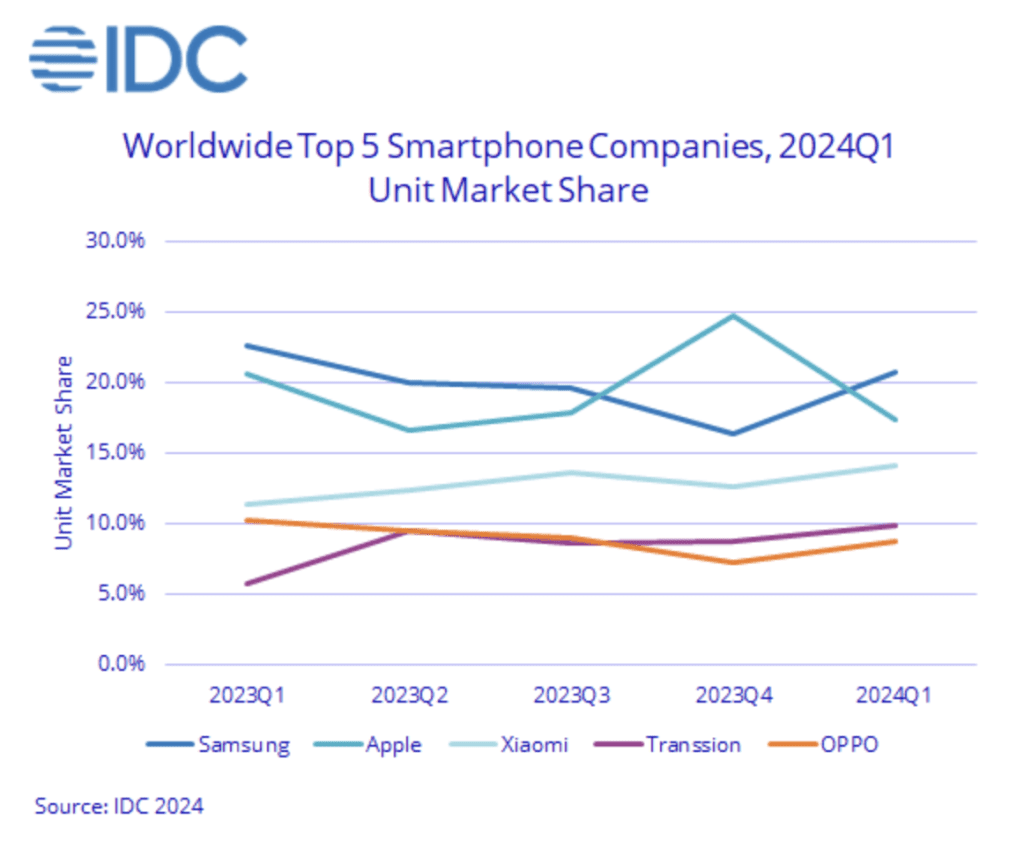 Ryan Reith รองประธานกลุ่มบริหารฝ่าย Worldwide Mobility and Consumer Device Trackers ของ IDC กล่าวว่า ตามที่คาดการณ์ไว้ การฟื้นตัวของตลาดสมาร์ทโฟนกำลังดำเนินต่อไป แม้แอปเปิลจะประสบความสำเร็จในการเป็นผู้นำตลาดในช่วงปลายปี 2566 แต่ซัมซุงก็สามารถกลับมาครองตำแหน่งผู้จัดจำหน่ายสมาร์ทโฟนรายใหญ่ที่สุดในไตรมาสแรกได้สำเร็จ