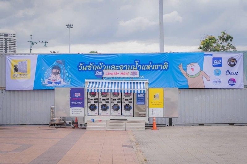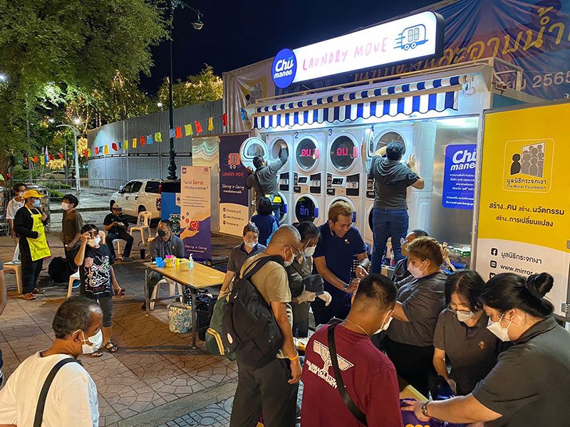 เย็นต่อค่ำวันพุธที่ 8 มิถุนายนที่ผ่านมา หากใครเดินทางผ่านบริเวณท้องสนามหลวง ตรงพื้นที่ด้านหลังศาลพระแม่ธรณีบีบมวยผม จะพบเห็นกิจกรรมที่คนไร้บ้านจำนวนกว่า 200 คน นำเสื้อผ้ามาซักที่เครื่องซักผ้าแบบหยอดเหรียญที่ตั้งเรียงรายอยู่บนรถกระบะพ่วงที่มองเผิน ๆ เหมือน Food Truck แต่ไม่มีอาหาร มีแต่เครื่องซักผ้า เครื่องอบผ้า และห้องอาบน้ำ แต่เป็น Laundry Move ของบริษัท ชูมณี จำกัด (Chu Manee)