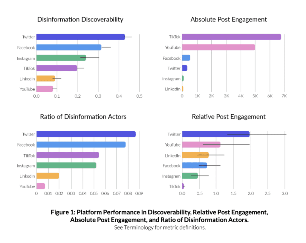 Absolute Post Engagement ผลการวิจัยพบว่าเวลามีข่าวลวงออกมา TikTok มีปฏิสัมพันธ์กับข่าวชิ้นนั้นมากที่สุด รองลงมาเป็น YouTube แต่ถ้าทำฐานผู้ใช้ให้เท่ากันหมดทุกแพลตฟอร์ม กลายเป็น X มีปฏิสัมพันธ์กับข่าวชิ้นนั้นมากที่สุด
