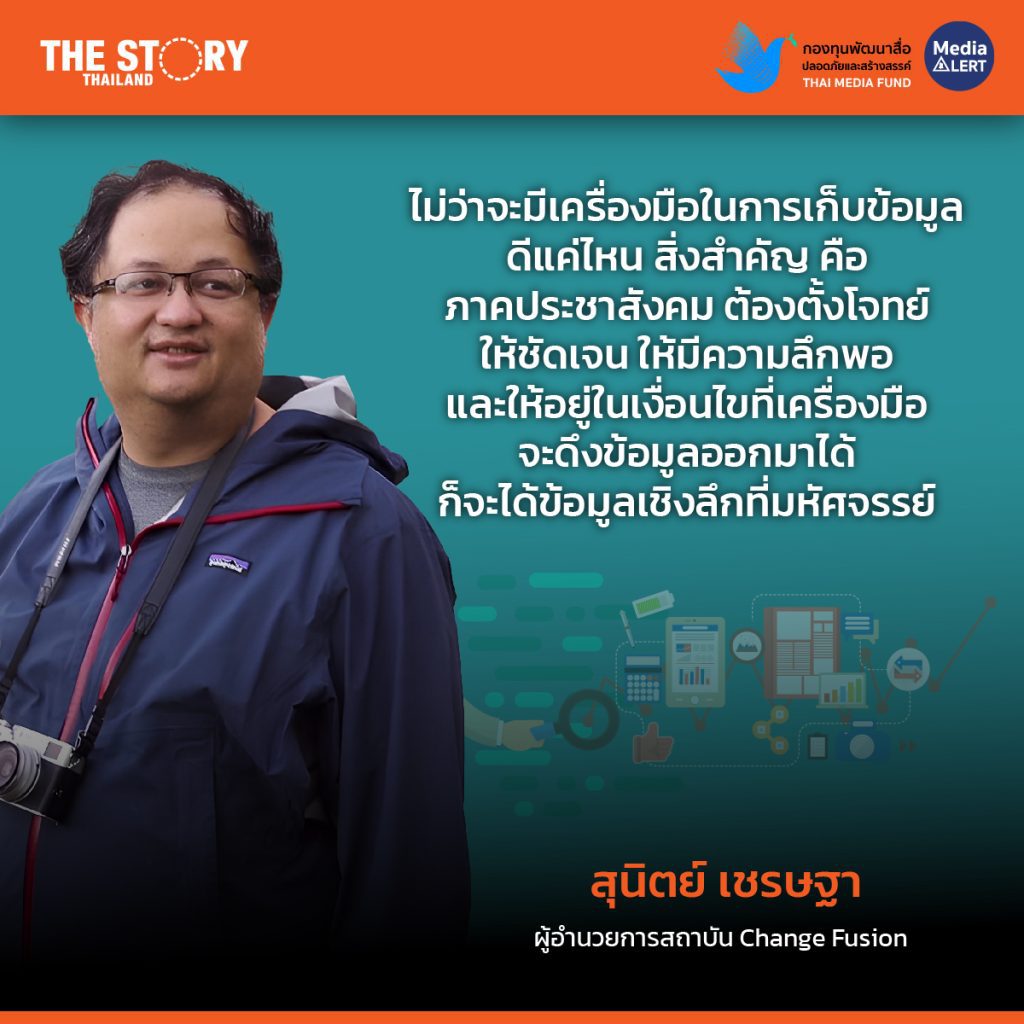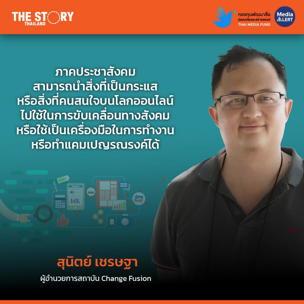 The Story Thailand ชวน สุนิตย์ เชรษฐา ผู้อำนวยการ สถาบัน Change Fusion มาให้มุมมองพร้อมข้อเสนอแนะว่าภาคประชาสังคมจะสามารถนำข้อมูลการสำรวจความสนใจของคนบนโลกออนไลน์ไปใช้ขับเคลื่อนสังคมอย่างไรได้บ้าง และช่วยวิเคราะห์ว่าประเด็นที่ได้รับยอด Engagement สูง ๆ มาจากปัจจัยหลักอะไรและสามารถเป็นกระจกสะท้อนสภาพการณ์ในสังคมได้จริงแท้เพียงใด รวมไปถึงข้อเสนอแนะต่อบทบาททางสังคม และธรรมาภิบาลของแพลตฟอร์มต่าง ๆ