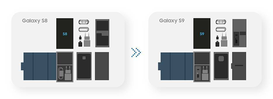 สำหรับการเปิดตัว Galaxy S9 ซัมซุงได้เพิ่มความพยายามในการลดขยะประเภทพลาสติกมากยิ่งขึ้น ด้วยการเปลี่ยนถาดอุปกรณ์จากพลาสติกเป็นเป็นวัสดุที่ทำจากเยื่อกระดาษขึ้นรูป (Pulp-mold) และวัสดุที่ผ่านกระบวนการ Upcycle