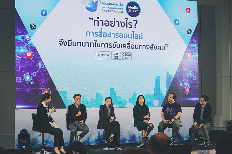การสัมมนาประจำปี Media Alert กองทุนพัฒนาสื่อปลอดภัยและสร้างสรรค์ เมื่อปลายเดือนมีนาคม 67 นำเสนอวิดีทัศน์ผลการศึกษา “การสื่อสารทางออนไลน์ของสังคมไทยตลอดปี 2566” ที่ Media Alert ร่วมดำเนินการกับบริษัท ไวซ์ไซท์ (ประเทศไทย) จำกัด และพบว่า ประเด็นการเมืองได้รับความสนใจสูงสุดในสัดส่วนถึงกว่าร้อยละ 58 โดย TikTok เป็นแพลตฟอร์มที่สามารถสร้างยอด Engagement สูงสุด 50% จากการสื่อสารในเกือบทุกกลุ่มเนื้อหา ขณะที่ผู้ใช้งานทั่วไป คือ ผู้สร้าง Engagement ถึงครึ่งหนึ่งของการสื่อสารออนไลน์ทั้งหมด ต่อท้ายวิดีทัศน์เสนอผลการศึกษา ด้วยการเสวนาหัวข้อ “ทำอย่างไร? การสื่อสารออนไลน์จึงมีบทบาทในการขับเคลื่อนทางสังคม” จากวิทยากรผู้เชี่ยวชาญในงาน ข้อมูล แพลตฟอร์ม สื่อมวลชน การขับเคลื่อนทางสังคม และวิชาการ