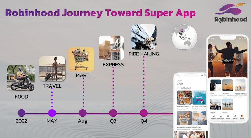 ปี 2022 โรบินฮู้ดเดินหน้าขยาย 2 แกน แกนแรกคือการขยายพื้นที่การให้บริการทั้งในประเทศ อาทิ ชลบุรี หัวหิน ภูเก็ต และเชียงใหม่ และการขยายไปตลาด SEA แกนที่สองคือขยายบริการภายใต้เส้นทางสู่การเป็น Super App ที่จะต้องมีบริการที่ครอบคลุมความต้องการใช้งานในทุกวันของลูกค้า ได้แก่ การเดินทาง (Travel) ที่เพิ่งเปิดให้บริการไปตั้งแต่เดือนพฤษภาคมที่ผ่านมมา บริการตลาด (Mart) ในเดือนสิงหาคม บริการขนส่ง (Express) ในไตรมาสที่ 3 และบริการ Ride-hailing ในไตรมาสที่ 4 ของปีนี้