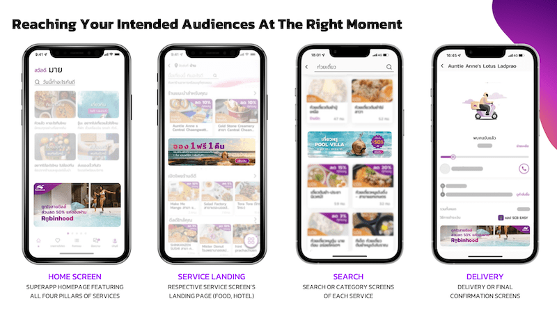 โฆษณาบนโรบินฮู้ดจะถูกสอดแทรกนำเสนอให้ลูกค้าเห็นในระหว่างเส้นทางการใช้บริการบนแพลตฟอร์ม ในเบื้องต้นจะมีการแสดงโฆษณาอยู่ 4 ที่ 4 แบบ คือ หน้าโฮมหลัก (Super App Home Screen) หน้าแรกของบริการ (Service Landing Page) หน้าค้นหา (Search Landing Page) และหน้ายืนยันการสั่ง/ใช้บริการ (Delivery or Final Confirmation Screen)