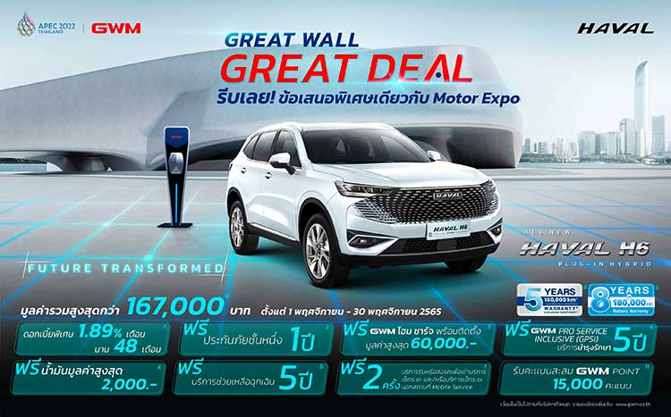 - All New HAVAL H6 Plug-in Hybrid SUV – รับดอกเบี้ยพิเศษ 1.89% นาน 48 เดือน ฟรีประกันภัยชั้นหนึ่ง 1 ปีเต็ม ฟรี GWM โฮม ชาร์จ พร้อมติดตั้ง มูลค่าสูงสุด 60,000 บาท แพ็กเกจบำรุงรักษา GWM PRO Service Inclusive (GPSI) 5 ปี หรือ 100,000 กิโลเมตร พร้อมบริการรับหรือส่งรถเพื่อเข้าบริการบำรุงรักษาตามระยะทาง และ/หรือ บริการเช็คระยะนอกสถานที่ (GWM Mobile Service) จำนวน 2 ครั้ง ฟรี น้ำมันมูลค่าสูงสุด 2,000 บาท รับคะแนนสะสม GWM Point 15,000 คะแนน และสิทธิประโยชน์อื่นๆ อีกมากมาย รวมมูลค่ากว่า 167,000 บาท