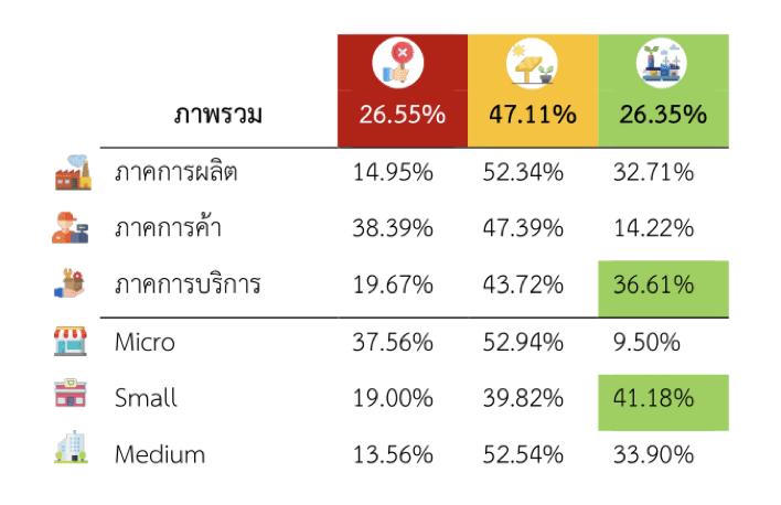 โดยกลุ่ม SMEs ขนาดเล็ก มีการดำเนินการที่เป็นมิตรต่อสังคมและสิ่งแวดล้อมอย่างเข้มข้น (กลุ่มสีเขียวมากกว่าขนาดอื่น) และธุรกิจในภาคบริการมีการดำเนินงานที่เป็นมิตรต่อสังคมและสิ่งแวดล้อมมากกว่าธุรกิจประเภทอื่น
