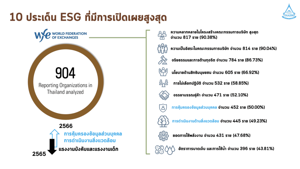 เมื่อพิจารณาประเด็นด้าน ESG ตามตัวชี้วัด WFE ESG Metrics ของสมาพันธ์ตลาดหลักทรัพย์โลก พบว่า ประเด็นด้านธรรมาภิบาล มีความก้าวหน้ามากสุดที่ 5.12 คะแนน โดยมีการเปิดเผยข้อมูลสูงสุดสามอันดับแรกในเรื่องความหลากหลายในโครงสร้างคณะกรรมการบริษัท (90.38%) ความเป็นอิสระในคณะกรรมการบริษัท (90.04%) จริยธรรมและการต้านทุจริต (86.73%) ส่วนประเด็นด้านสังคม มีความก้าวหน้ารองลงมาที่ 3.27 คะแนน โดยมีการเปิดเผยข้อมูลสูงสุดสามอันดับแรกในเรื่องนโยบายด้านสิทธิมนุษยชน (66.92%) การไม่เลือกปฏิบัติ (58.85%) และอัตราการบาดเจ็บ (43.81%) ขณะที่ประเด็นด้านสิ่งแวดล้อม มีความก้าวหน้าอยู่ที่ 2.18 คะแนน โดยมีการเปิดเผยข้อมูลสูงสุดสามอันดับแรกในเรื่องการดำเนินการด้านสิ่งแวดล้อม (49.23%) ยอดการใช้พลังงาน (47.68%) และการใช้น้ำ (43.81%)