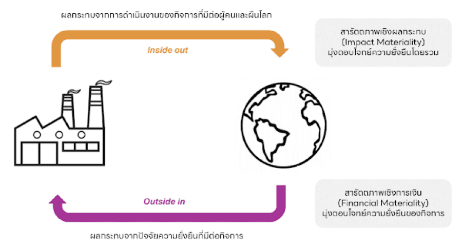 โดยการประเมินทวิสารัตถภาพ ประกอบด้วย การพิจารณาที่ผนวกการวิเคราะห์สารัตถภาพทางการเงินที่เป็นผลจากปัจจัยด้านเศรษฐกิจ สังคม และสิ่งแวดล้อม (แบบ Outside-in) เข้ากับการวิเคราะห์สารัตถภาพเชิงผลกระทบที่เกิดจากองค์กรทั้งทางด้านเศรษฐกิจ สังคม และสิ่งแวดล้อม (แบบ Inside-out)