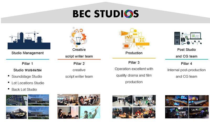 BEC Studio (บีอีซี สตูดิโอ) ถูกกำหนดให้ทำหน้าที่เครื่องจักรแห่งการเติบโต กับเป้าหมายการเป็นผู้ผลิตคอนเทนต์แบบครบวงจรเพื่อป้อนตลาดไทยและตลาดต่างประเทศ