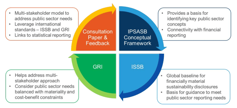 ปัจจุบัน IPSASB กำลังผลักดันการออกเอกสารที่มีความเร่งด่วนใน 3 เรื่อง ได้แก่ 1) ข้อกำหนดทั่วไปสำหรับการเปิดเผยข้อมูลทางการเงินเกี่ยวกับความยั่งยืน 2) การเปิดเผยข้อมูลเกี่ยวกับสภาพภูมิอากาศ และ 3) การเปิดเผยข้อมูลที่มิใช่ตัวเงิน: ทรัพยากรธรรมชาติ