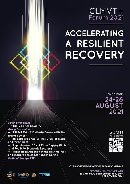 สำนักงานนโยบายและยุทธศาสตร์การค้า (สนค.) กระทรวงพาณิชย์ ชวนร่วมงาน “CLMVT+ Forum 2021” ในหัวข้อ “Accelerating a Resilient Recovery” มุ่งสู่การฟื้นฟูทางเศรษฐกิจที่แข็งแกร่ง ผ่านทางช่องทาง Webinar (Zoom) ระหว่างวันที่ 24-26 สิงหาคม 2564 นี้
