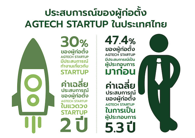 จากผลการสำรวจพบข้อมูลที่น่าสนใจและเป็นประโยชน์ในหลายมิติโดยในพ.ศ. 2563 มีสตาร์ตอัพด้านการเกษตรจำนวน 53 ราย (กลุ่มเทคโนโลยีการบริหารจัดการฟาร์มเซนเซอร์และระบบ IoT มีจำนวนสูงสุด) อายุธุรกิจเฉลี่ย 4.7 ปี สามารถแบ่งเป็นระยะเริ่มต้น (Seed State) ร้อยละ 52.5 ระยะทดสอบไอเดีย (Pre-seed) ร้อยละ 27.5 และระยะเติบโตอย่างรวดเร็ว (Growth) ร้อยละ 20 ซึ่งจะกระจายตัวในกรุงเทพฯและปริมณฑล
