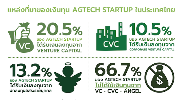 ทั้งนี้ จากการเก็บข้อมูลและสัมภาษณ์ สตาร์ตอัพด้านการเกษตรร่วมกับศึกษาข้อมูลจากการะดมทุนจำนวน 41 รายพบว่า มีจำนวนเงินลงทุนสูงถึง 772 ล้านบาทซึ่งร้อยละ 66.7 เป็นการลงทุนภายนอกไม่ได้รับเงินลงทุนจากหน่วยงานร่วมลงทุนที่เป็น VC CVC หรือ Angel Investor สะท้อนให้เห็นว่าระบบนิเวศของประเทศไทยอยู่ในระยะเริ่มต้นที่ต้องอาศัยการผลักดันและร่วมมือจากทุกภาคส่วน เพื่อเพิ่มจำนวนและศักยภาพของสตาร์ตอัพให้มีความสามารถในการแข่งขันและการเติบโตอย่างรวดเร็ว โดยเฉพาะในกลุ่มการใช้เทคโนโลยีชีวภาพทางการเกษตรที่มีปริมาณเงินลงทุนน้อยเมื่อเทียบกับในต่างประเทศที่มีการลงทุนในกลุ่มนี้สูงมาก