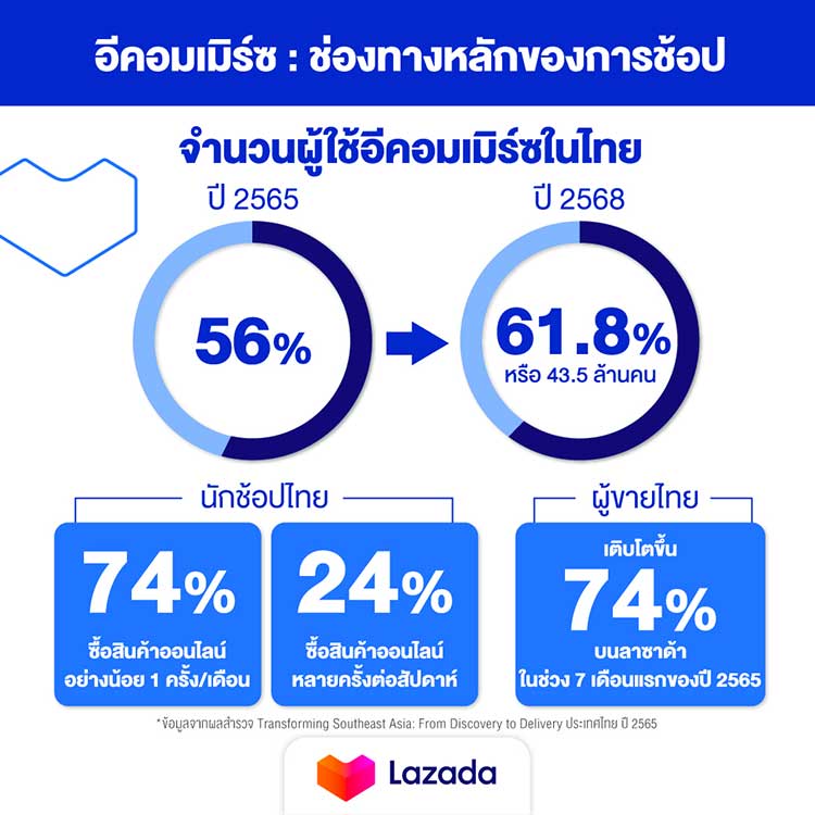 จากพฤติกรรมดังกล่าว ดร. วีระพงศ์ โก ประธานเจ้าหน้าที่บริหาร ลาซาด้า ประเทศไทย กล่าวถึงโอกาสในการเข้าถึงกลุ่มเป้าหมายผ่านอีคอมเมิร์ซที่ยังมีช่องว่างในการเติบโตได้อีกมาก “จากสถิติ คนไทยเข้าถึงอีคอมเมิร์ซมากถึง 56% ในปี 2565 และคาดว่าจะเพิ่มเป็น 61.8% ในปี 2568 ทำให้แบรนด์และผู้ประกอบการจำนวนมากได้ปรับตัวและเข้ามาสร้างธุรกิจในช่องทางนี้