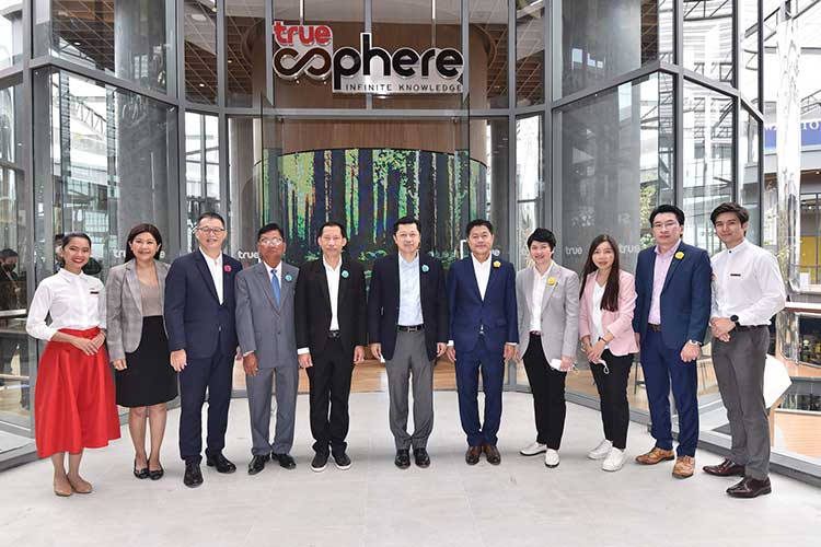 ศุภชัย เจียรวนนท์ (กลาง) ประธานคณะผู้บริหาร เครือเจริญโภคภัณฑ์ พร้อมด้วย ดร.ปพนธ์ รัตนชัยกานนท์ (ที่ 3 จากซ้าย) ผู้ช่วยบริหารงานประธานคณะกรรมการบริหาร บมจ. ทรู คอร์ปอเรชั่น และ กรรมการผู้จัดการใหญ่ ธุรกิจอาหาร และคอฟฟี่ เฮาส์ บริษัท ทรู ไลฟ์สไตล์ รีเทล จำกัดและ สุจิตรา อมิตรพ่าย (ที่ 2 จากซ้าย) ผู้อำนวยการ ด้านปฏิบัติการ ทรูรีเทล ทรูแบรนดิ้งช้อป และทรูสเฟียร์ ร่วมเปิด “ทรูสเฟียร์ (Truesphere)” โค-เวิร์คกิ้ง สเปซ ระดับเฟิร์สคลาส แห่งใหม่ สาขาที่ 14 ณ “โลตัส นอร์ธราชพฤกษ์”