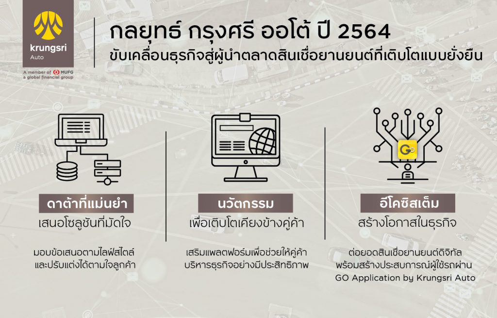นอกจากนี้ การผลักดันโมเดลธุรกิจใหม่เพื่อเข้าถึงกลุ่มผู้ใช้รถที่กว้างขึ้นถือเป็นอีกหนึ่งปัจจัยผลักดันความสำเร็จของ กรุงศรี ออโต้ ในปีนี้ กรุงศรี ออโต้ จะขับเคลื่อนอีโคซิสเต็มเพื่อสร้างโอกาสในธุรกิจโดย GO Application by Krungsri Auto ยังคงเป็นแพลตฟอร์มหลักในการส่งมอบผลิตภัณฑ์และบริการดิจิทัลทั้งหมด โดยเฉพาะอย่างยิ่งบริการสินเชื่อยานยนต์ดิจิทัลเต็มรูปแบบ ยิ่งไปกว่านั้น ยังผนึกกำลังกับพันธมิตรเพื่อส่งมอบบริการด้านไลฟ์สไตล์ ผู้ใช้รถ เช่น บริการบำรุงรักษารถร่วมกับแบรนด์รถยนต์ชั้นนำ และโปรแกรมสิทธิประโยชน์ร่วมกับ The 1 เป็นต้น