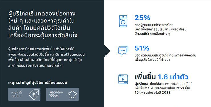 ยิ่งไปกว่านั้น ช่องทางอีคอมเมิร์ซทางเลือกอย่างการส่งข้อความเชิงธุรกิจและการช้อปผ่านวิดีโอไลฟ์ ยังเป็นปัจจัยสำคัญที่ส่งผลต่อการเติบโตของอีคอมเมิร์ซในไทย หรือคิดเป็นกว่าร้อยละ 25 ของเม็ดเงินที่ใช้จ่ายทั้งหมดในประเทศ ในขณะที่กลุ่มตัวอย่างเกือบครึ่งหนึ่งระบุว่าโซเชียลมีเดียสร้างการค้นพบผ่านช่องทางออนไลน์ โดยเป็นการค้นพบผ่านรูปภาพ (ร้อยละ 15) วิดีโอ (ร้อยละ 26) และเครื่องมือที่เกี่ยวข้องอื่น ๆ เช่น การส่งข้อความ เป็นต้น (ร้อยละ 9)