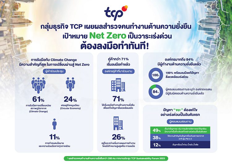 งานประชุม TCP Sustainability Forum 2023 ภายใต้แนวคิด “Net Zero Transition…From Commitment to Action” หรือ “การเปลี่ยนผ่านสู่ Net Zero จากพันธสัญญาสู่การปฏิบัติ” อีกหนึ่งความตั้งใจจริงในการปลุกพลังความร่วมมือของภาคธุรกิจ เพื่อการเปลี่ยนแปลงอย่างยั่งยืน โดยมีผู้เข้าประชุมมากกว่า 200 คน นอกจากจะได้รับฟังความคิดเห็น และแลกเปลี่ยนประสบการณ์จากนักวิชาการภาคสังคม นักธุรกิจ นักคิด นักปฏิบัติ และพันธมิตรในแวดวงธุรกิจอาหารและเครื่องดื่มแล้วนั้น ผู้ร่วมงานยังได้ทำแบบสำรวจความคิดเห็น สะท้อนมุมมองต่อวาระที่เร่งด่วนในการทำงานด้านความยั่งยืน โดยมีผลสำรวจที่น่าสนใจ ดังนี้