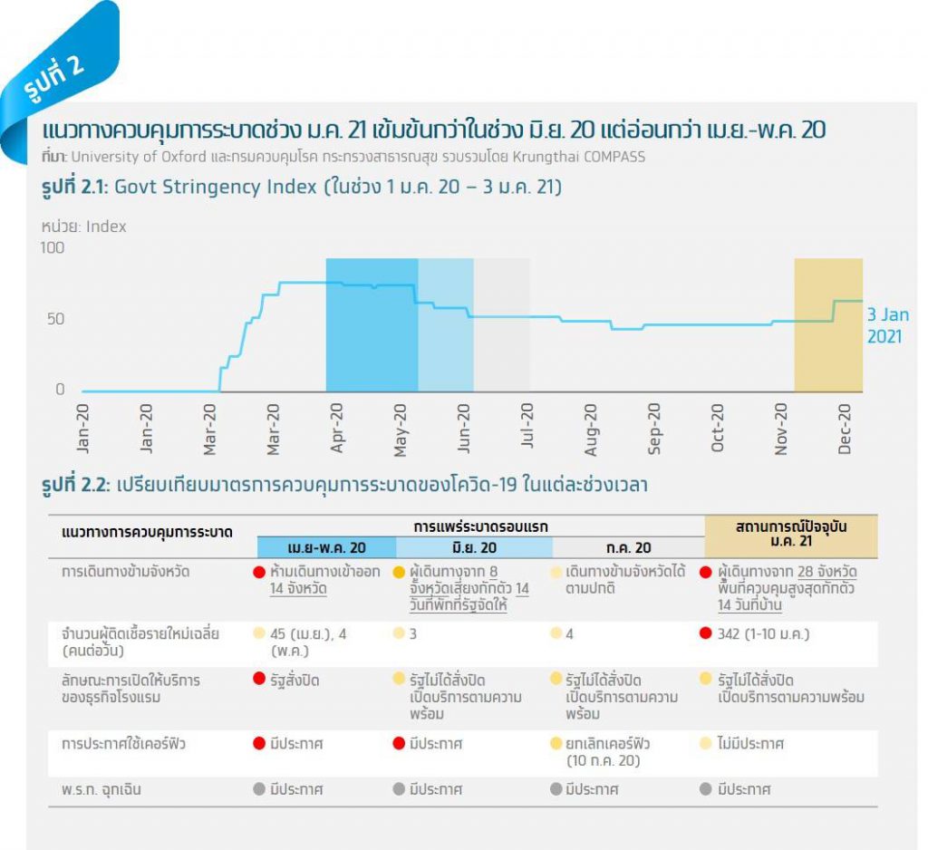 เมื่อพิจารณาความเข้มข้นของมาตรการควบคุมโรคผ่านดัชนีความเข้มงวดของมาตรการควบคุมโรค หรือ Government Stringency Index ก็จะเห็นได้ว่าดัชนีในเดือนมกราคม 2021 อยู่ที่ 64 มีค่ามากกว่าเดือนมิถุนายน 2020 ที่มีค่าอยู่ที่ 52-63 แต่ก็ยังน้อยกว่าช่วงเดือนเมษายนถึงพฤษภาคม 2020 ที่มีค่าในช่วง 68-76